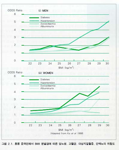 ÀÖ´Â Áß±¹ÀÎÀÇ ¿¬±¸°¡ ÀÖÀ¸¸ç(Ko 1999)(±×¸² 2.1), BMI >23 kg/m2¿¡¼ºÎÅÍ À¯º´·üÀÌ Áõ°¡ÇÑ´Ù.