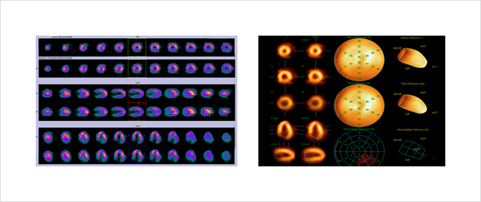 通过三维影像观察心脏肌肉的供血状态,可准确评估冠状动脉疾病的严重程度。 用药物给心脏带来压力的影像和休息期影像进行比较诊断。