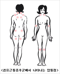 Àü½ÅÀûÀÎ ÇÇ·Î, Àü½ÅÅëÁõ, ¼ö¸é Àå¾Ö, °¨°¢ÀÌ»ó, ¾ÆÄ§¿¡ »»»»ÇÔÀÌ ½ÉÇÑ ¾ÆÄ§ °æÁ÷, °ú¹Î¼º ´ëÀå ÁõÈıº, ºÒ¾È, µÎÅë µî Àü½ÅÀÇ Áõ»óÀ» ÀÏÀ¸Å°´Â ¿øÀÎÀÌ È®½ÇÇÏÁö ¾ÊÀº ¸¸¼º ±â´É¼º ÁúȯÀ¸·Î ±ÙÀ°Á¶Á÷¿¡ ½ÇÁ¦ ¿°ÁõÀº ¾ø´Â ÁúȯÀÌ´Ù. ƯÁ¤ÇÑ °÷À» ÀÏÁ¤ÇÑ ÈûÀ¸·Î ´·¯º¸¸é ½ÉÇÑ ÅëÁõÀÌ ¹ß»ýÇÏ´Â ¾ÐÅëÁ¡ÀÌ ¿©·¯ °÷¿¡¼ ÀÖ´Â °ÍÀÌ °¡Àå Áß¿äÇÑ Æ¯Â¡À̸ç, ƯÈ÷ ¸ñ, µî, ¾î±ú, ¾ûµ¢ÀÌ ºÎÀ§¿¡¼ À¯¹ßµÈ´Ù. ÀÌ Áúȯµµ ´Ù¸¥ ·ù¸¶Æ¼½º Áúȯ°ú ¸¶Âù°¡Áö·Î ¿©ÀÚ¿¡°Ô¼ ¸¹ÀÌ ³ªÅ¸³´Ù. ¹Ì±¹ ·ù¸¶Æ¼½º ÇÐȸÀÇ Áø´Ü±âÁØÀº Àü½ÅÀÇ ÅëÁõ°ú ÇÔ²² ¾Æ·¡ ±×¸²°ú °°Àº 18°÷ÀÇ ¾ÐÅëÁ¡ Áß¿¡¼ 11°³ À̻󿡼 ¾ÐÅëÀ» ´À²¸¾ßÇÑ´Ù.