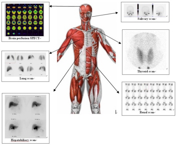 Nuclear medicine procedures use pharmaceuticals that have been labeled with radionuclides (radiopharmaceuticals). In diagnosis, radioactive substances are administered to patients and the radiation emitted is detected. The diagnostic tests involve the formation of an image using a gamma camera or positron emission tomography. Also radioiodine therapy is using for differentiated thyroid cancer or thyrotoxicosis