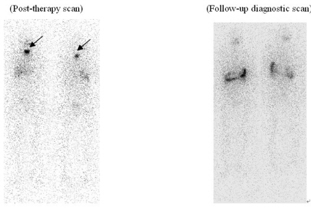 (Example)56 year-old female patient with papillary thyroid cancer underwent total thyroidectomy. High dose radioiodine therapy (150mCi) were performed and there were remnant thyroid tissue uptake on post-therapy scan (arrow). After 6 months, the remnant thyroid tissue was all disappeared with no significant iodine uptakes in diagnostic I-131 scan.