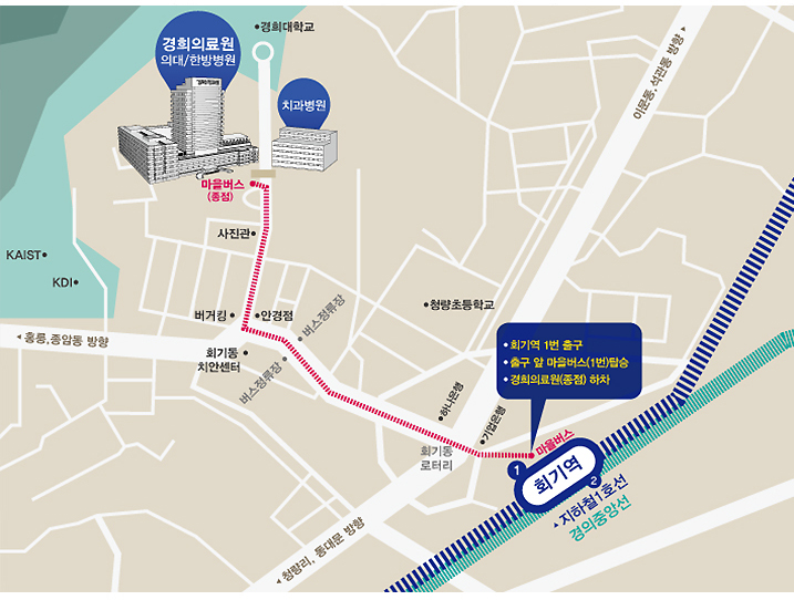 | 지하철 | 1호선, 경의중앙선 회기역 하차 - 1번 출구 마을버스 01번 연계 |